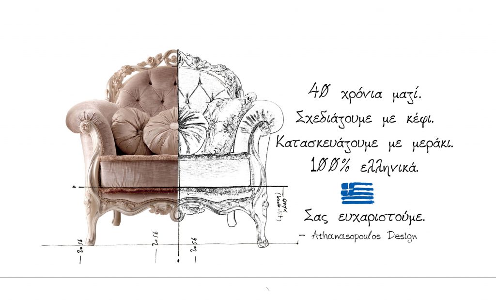 Η ομάδα της Athanasopoulos Design, 40 χρόνια και πλέον, σχεδιάζει το καθιστικό ή το σαλόνι σας, γεμάτη αγάπη για την τέχνη και την δημιουργία. Οπλισμένη με μεράκι και φιλότιμο, στοχοποιεί να ικανοποιήσει τα θέλω και τις επιθυμίες σας, κατασκευάζοντας χειροποίητους καναπέδες, κομμένους και ραμένους στα μέτρα σας, 100% ελληνικά.