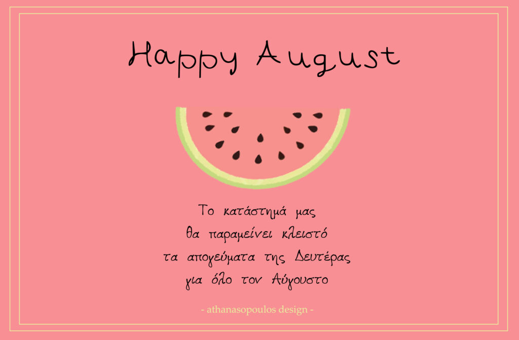 ΤΟ ΚΑΤΑΣΤΗΜΑ ΜΑΣ ΘΑ ΠΑΡΑΜΕΙΝΕΙ ΚΛΕΙΣΤΟ ΤΑ ΑΠΟΓΕΥΜΑΤΑ ΤΗΣ ΔΕΥΤΕΡΑΣ ΓΙΑ ΟΛΟ ΤΟΝ ΑΥΓΟΥΣΤΟ.
