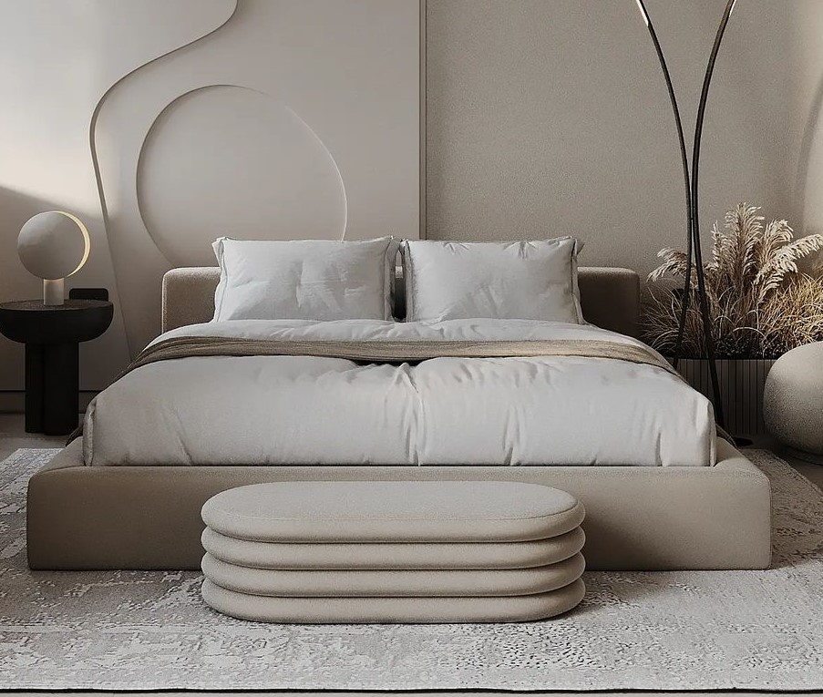 ∙ Πρόταση υφασμάτινου κρεβατιού, κατασκευασμένο απὀ μασίφ ξύλο επενδεδυμένο με ύφασμα επιλογής, και μίνιμαλ σχεδιασμό πλαισίου αλλά και κεφαλαριού καθώς και διακριτικά μεταλλικά πόδια στήριξης.