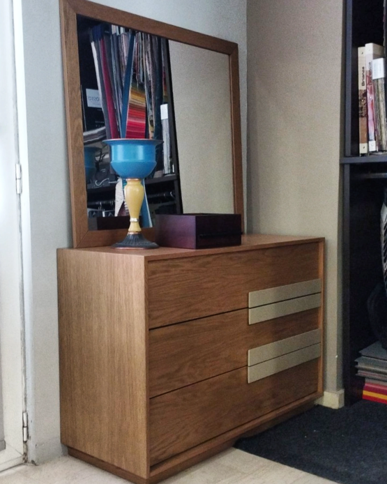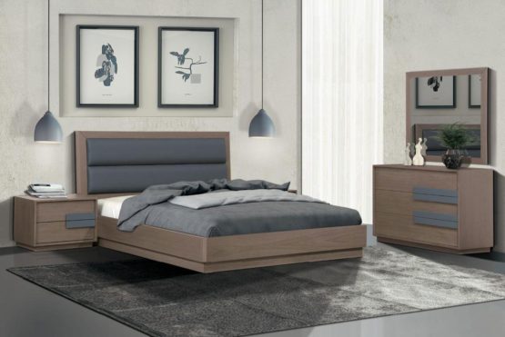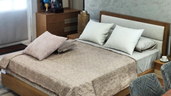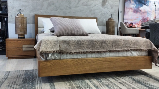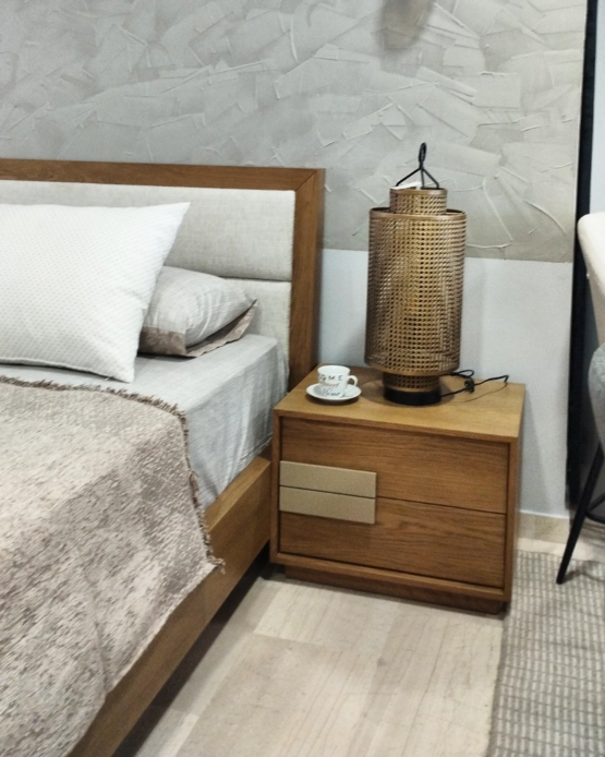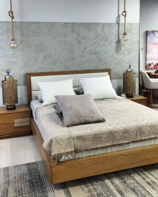 ∙ Πρόταση κρεβατοκάμαρας Day In, Day Out, κατασκευασμένη από μασίφ ξύλο, αποτελούμενη από κρεβάτι με ψηλό υφασμάτινο κεφαλάρι που μπορεί να επενδυθεί με ύφασμα επιλογής, δύο κομοδίνα και συρταριέρα συνοδευόμενη από επιτοίχιο καθρέφτη.