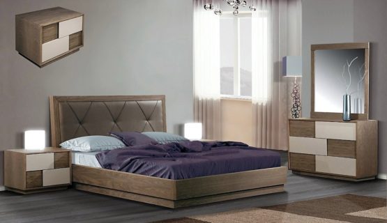 ∙ Πρόταση κρεβατοκάμαρας Fine Romance, κατασκευασμένη από μασίφ ξύλο, αποτελούμενη από κρεβάτι με ψηλό υφασμάτινο περίτεχνο κεφαλάρι που μπορεί να επενδυθεί με ύφασμα επιλογής, δύο κομοδίνα και συρταριέρα με λεπτομέρειες λάκας συνοδευόμενη από επιτραπέζιο καθρέφτη.