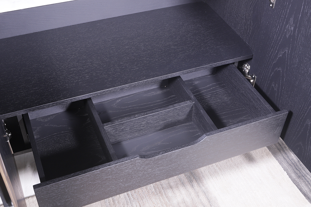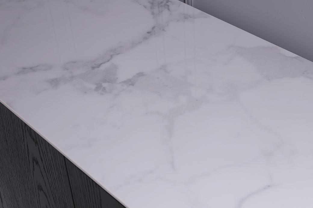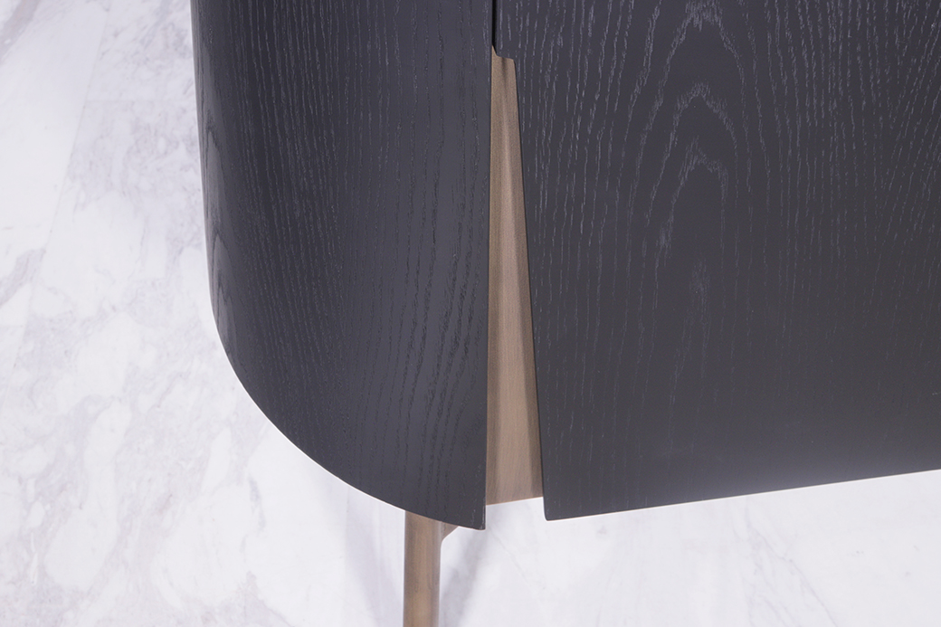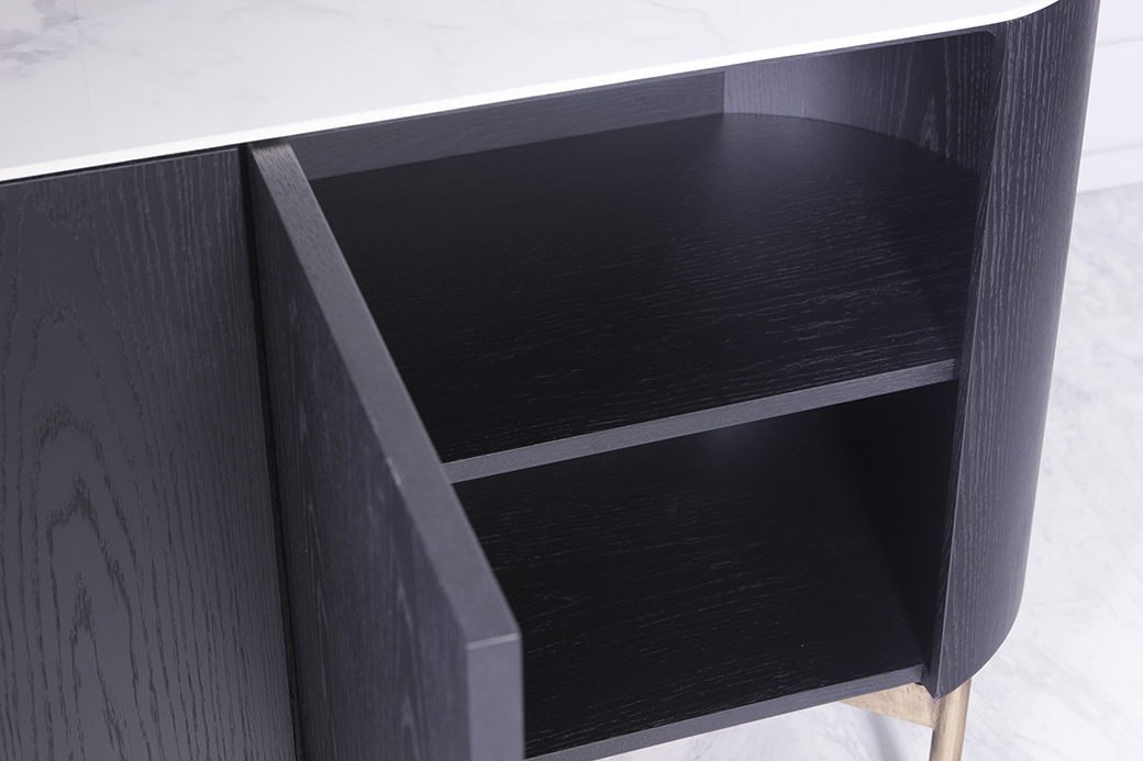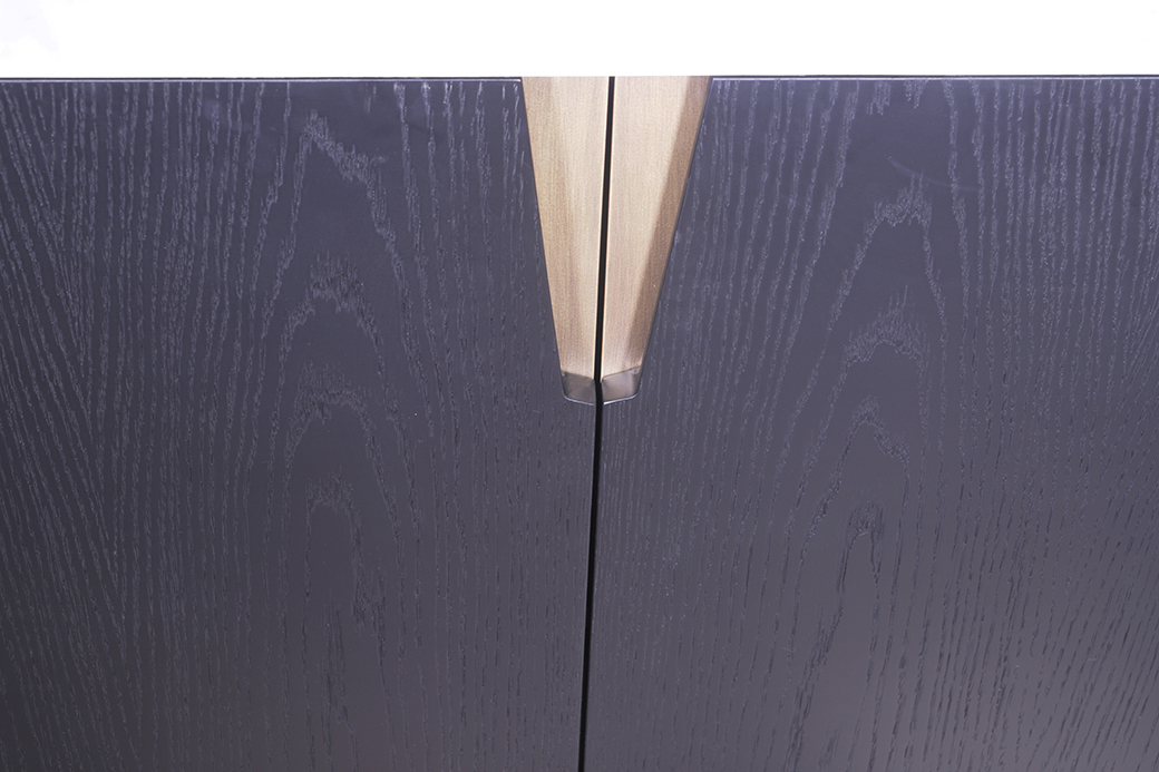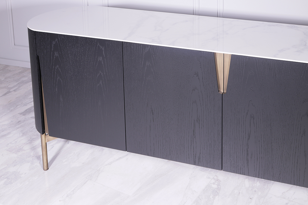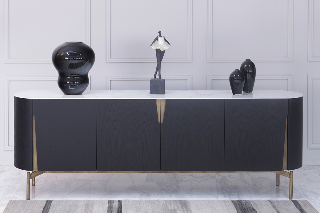∙ Ο μπουφές Clory σε δρυς φαρδύβενο με τις στρογγυλεμές άκρες ,τις ιδιαίτερες πτυχές σε χρυσοπατίνα, που λειτουργούν ώς χερούλια και η κεραμική του επιφάνεια, δημιουργούν ένα αποτέλεσμα πολυτέλειας και κομψότητας.Η μεταλλική του βάση με τα λεππά πόδια συμπληρώνει απόλυτα το φινετσάτο αποτέλεσμα.