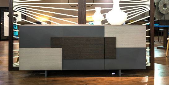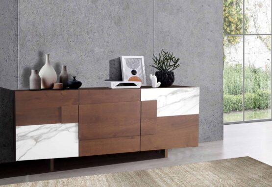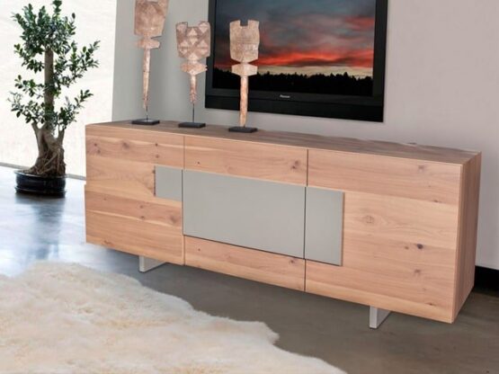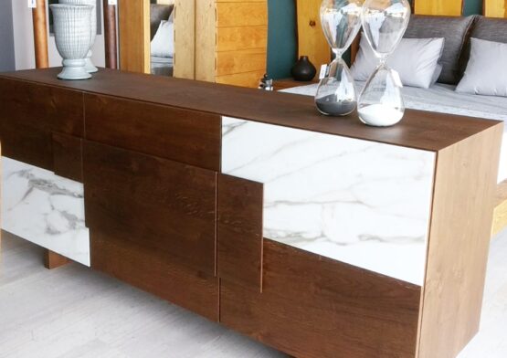 ∙ Μπουφές Joyfull, κατασκευασμένος από δρύ ρουστίκ καπλαμά με έντονους ρόζους, αποτελούμενος από ευρύχωρα ντουλάπια και ανισόπεδη τρισδιάστατη επιφάνεια πρώτης όψης.
