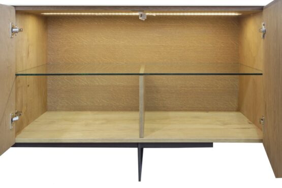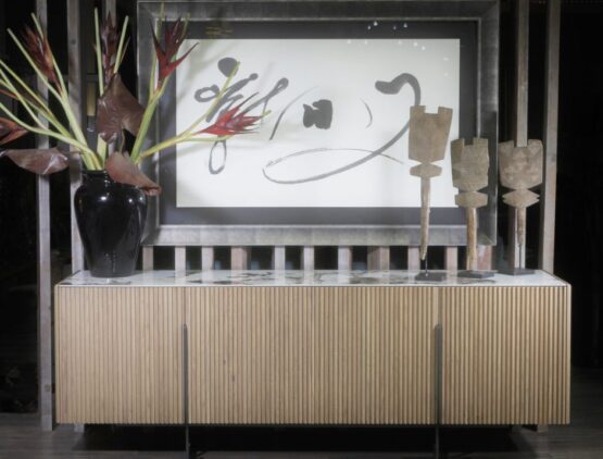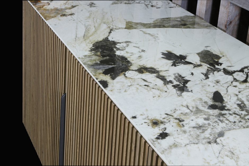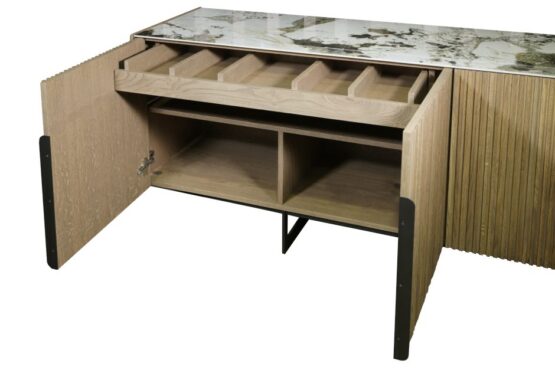 ∙ Μια συλλογή μονάδων αποθήκευσης που λόγω της κατασκευής τους μπορούν να προσαρμοστούν σε περισσότερο από ένα χώρους προσφέροντας διάφορες εναλλακτικές λύσεις. Χαρακτηριστικό αυτού του μπουφέ είναι ο συνδυασμός ξύλου με industrial στοιχεία και η πινελιά πολυτέλειας με την κεραμική επιφάνεια. Λόγω της χειροποίητης κατασκευής του, η μπροστινή επιφάνεια έχει ¨ντυθεί¨ όλη με πηχάκια από massif ξύλο χαρίζοντας επιπλέον κομψότητα στην όλη σύνθεση. Η εσωτερική δομή του είναι κατασκευασμένη από MDF επικαλυμμένη με καπλαμά από ρουστίκ δρυ.