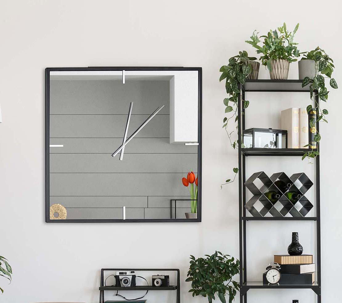 ∙ Ρολόι τοίχου-καθρέπτης Olivia, σε τετράγωνο σχεδιασμό με διακριτική μεταλλική κορνίζα.