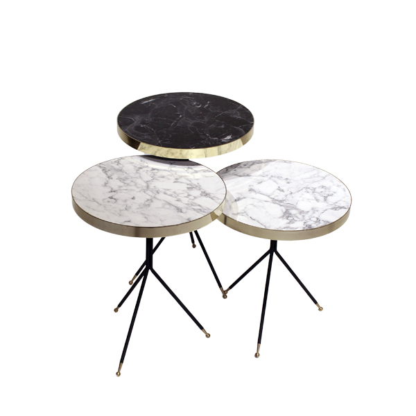 • Σετ βοηθητικών τραπεζιών καθιστικού, αποτελούμενο από τρία τεμάχια, σε διαφορετικές διαστάσεις και αποχρώσεις.