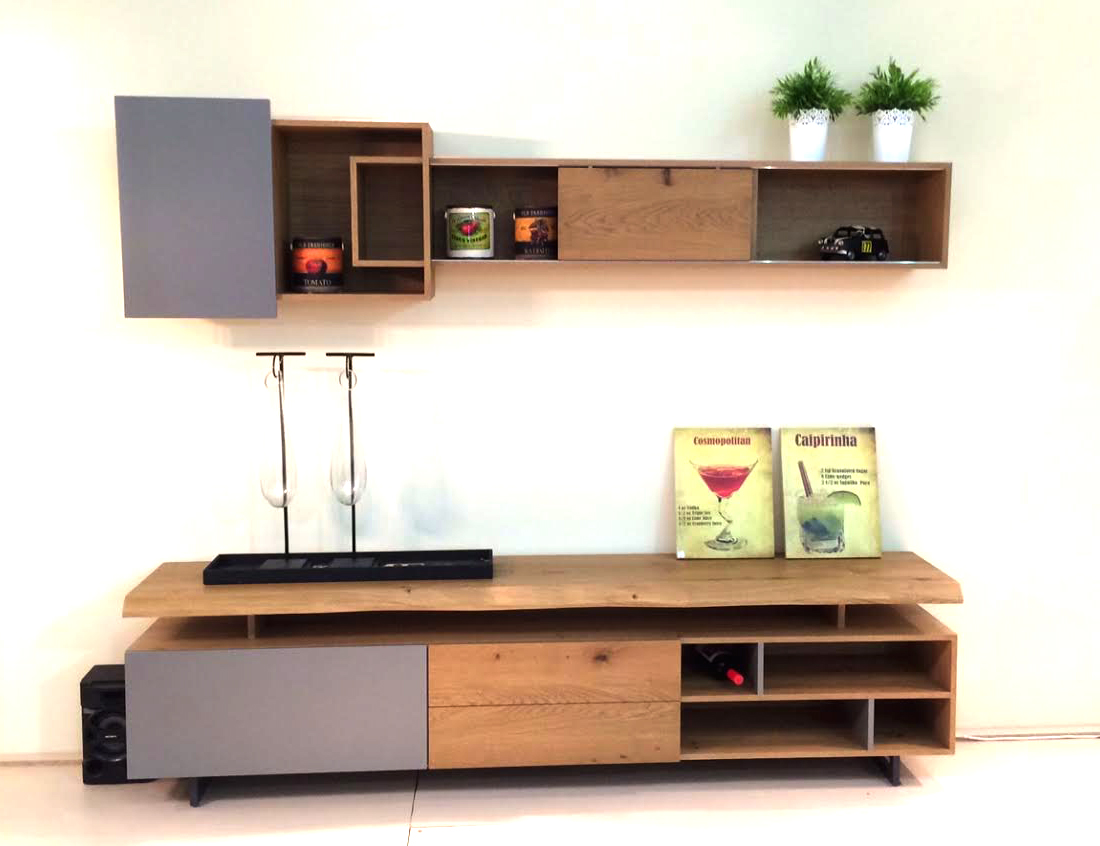 ∙ Σύνθεση τοίχου Jack Flash, κατασκευασμένη απὀ μασίφ ξύλο, αποτελούμενη από αναρτώμενο ντουλάπι και ράφι και επιδαπέδια βάση με ανοιχτά και κλειστἀ στοιχεία.