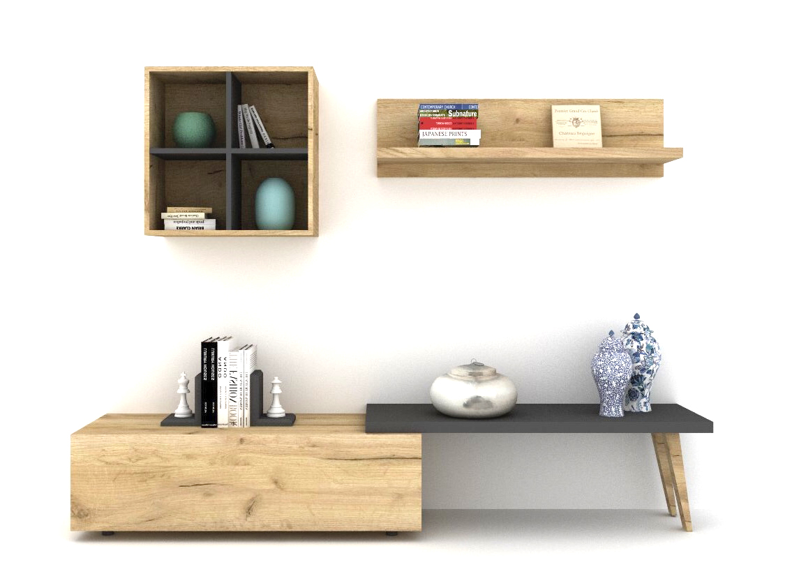 ∙ Σύνθεση τοίχου Join, κατασκευασμένη απὀ βακελίτη υψηλής ποιότητας, αποτελούμενη από αναρτώμενα ράφια και επιδαπέδια βάση με ανοιχτά και κλειστἀ στοιχεία.