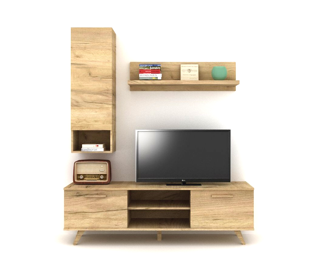 ∙ Σύνθεση τοίχου Linea, κατασκευασμένη απὀ βακελίτη υψηλής ποιότητας, αποτελούμενη από αναρτώμενα ντουλάπια και ράφια και επιδαπέδια βάση με ανοιχτά και κλειστἀ στοιχεία.