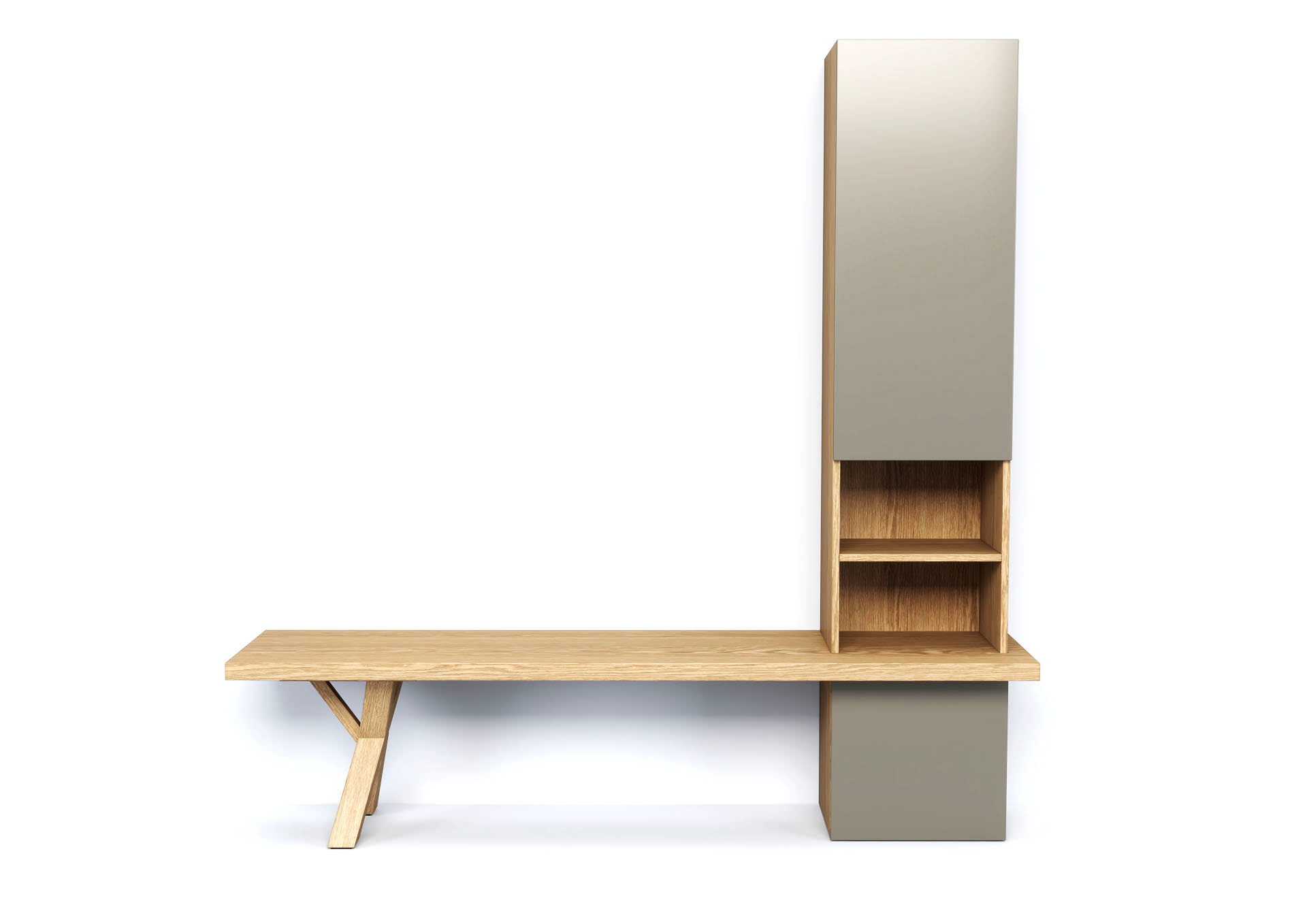∙ Σύνθεση τοίχου Next από Fisiko, κατασκευασμένη από μασίφ ξύλο, αποτελούμενη από επιδαπέδια ψηλή κατασκευή με ντουλάπια και ράφια και επιδαπέδια βάση.