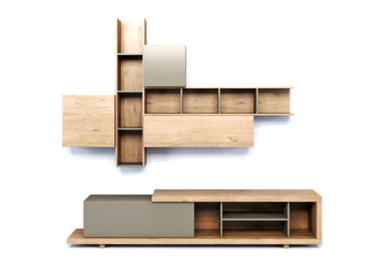 ∙ Σύνθεση τοίχου Olive από Fisiko, κατασκευασμένη από μασίφ ξύλο, αποτελούμενη από αναρτώμενα ντουλάπια και ράφια και επιδαπέδια βάση με ανοιχτά και κλειστά στοιχεία.