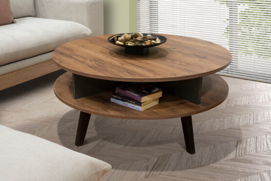To τραπεζάκι σαλονιού OLIVER αποτελεί τη στρογγυλή εκδοχή του τραπεζιού MILANO. Ανάμεσα στις δύο παράλληλες επιφάνειες υπάρχει ένας ξύλινος σταυρός που διαμορφώνει 4 πρακτικούς χώρους για διακόσμηση και τοποθέτηση αντικειμένων.
