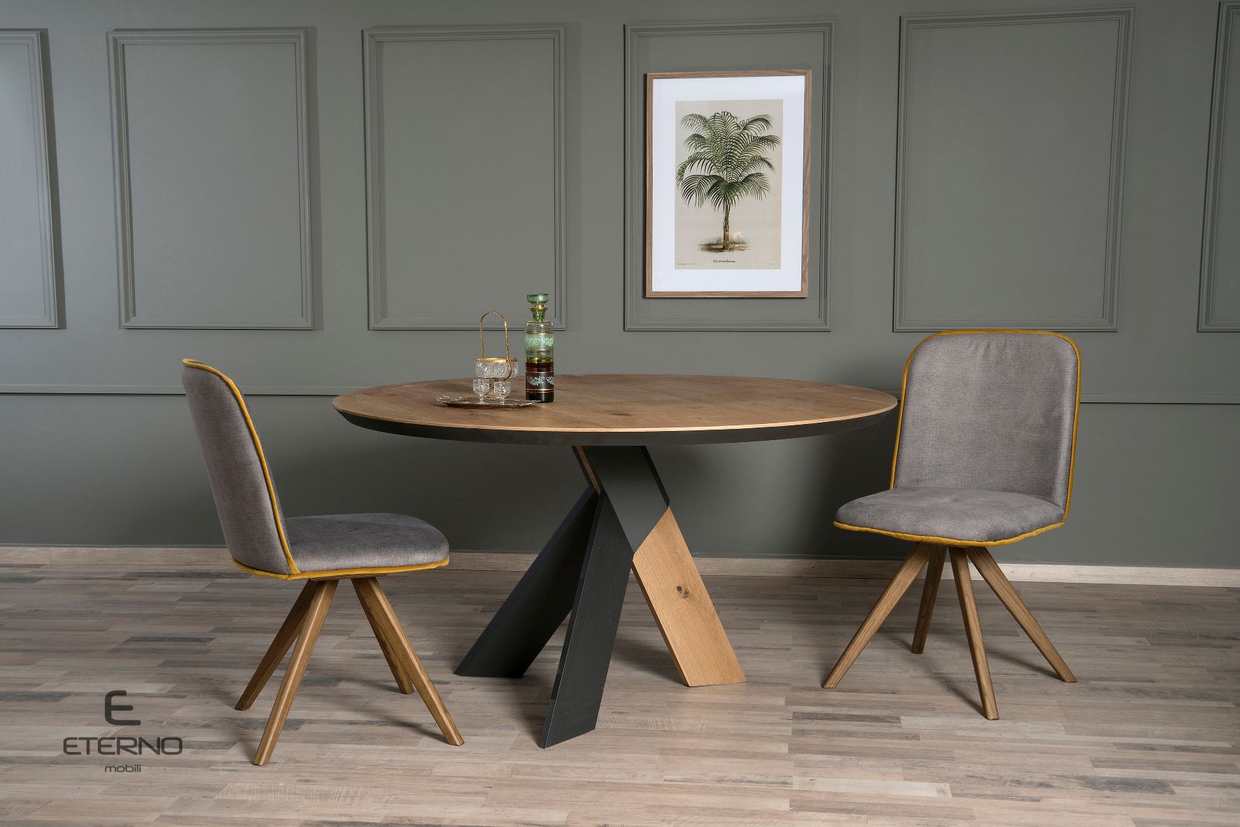 ∙ Τραπεζαρία ροτόντα Flex από Eterno, σχεδιασμένη με γεωμετρική λογική εστιάζει το ενδιαφέρον στα πόδια του τραπεζιού που είναι τριγωνικά και δημιουργούν ένα ευχάριστο οπτικό παιχνίδι.