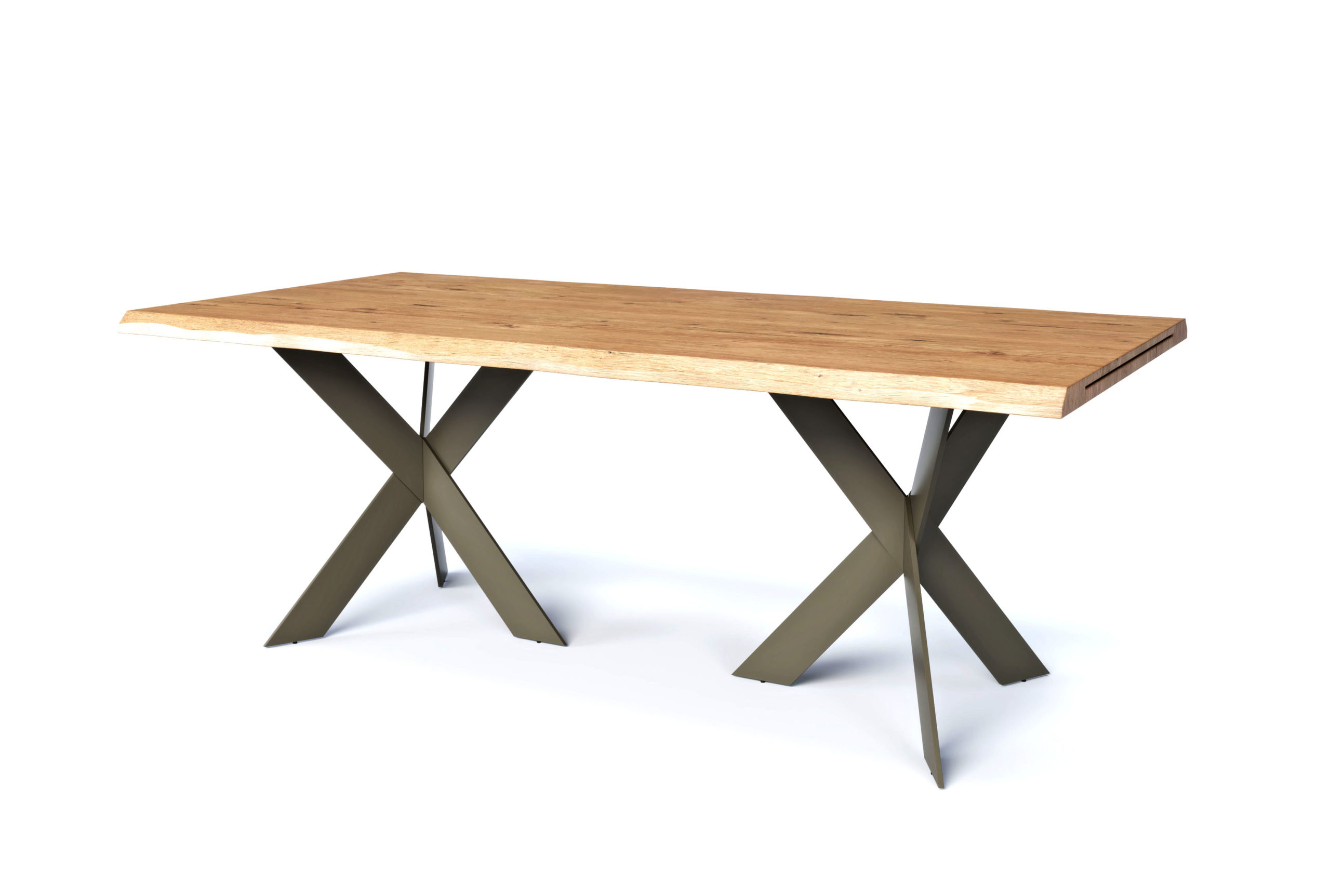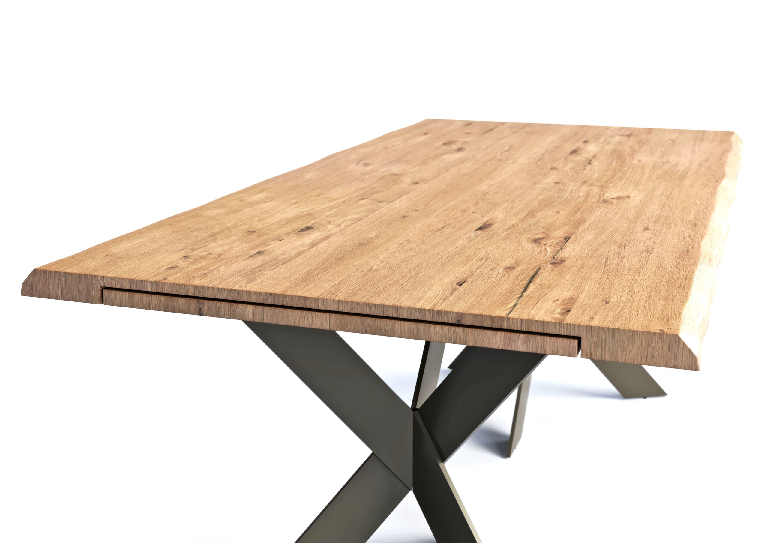 ∙ Τραπεζαρία Forest, κατασκευασμένη από μασίφ ξύλο, ανοιγόμενη, με μεταλλικά πὀδια στήριξης και σχεδιαστική λεπτομέρεια ξεφραδίσματος στα πλαινά.