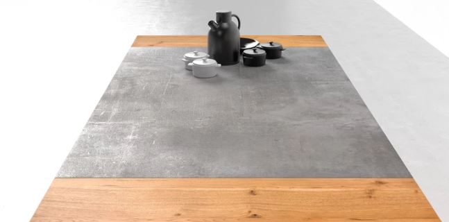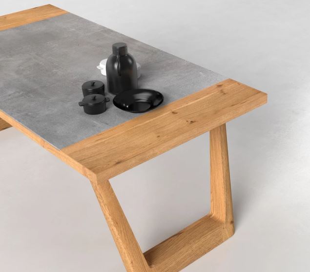 ∙ Η κεραμική επιφάνεια, η οποία διατίθεται σε πέντε διαφορετικές αποχρώσεις, συνδυάζεται φυσικά με τη vintage επένδυση σε καπλαμά, δημιουργώντας μια ισορροπημένη σύμπνοια χρώματος και κατασκευής ενώ η δρύινη βάση από μασίφ ξύλο ακολουθεί ένα rustic ύφος, το οποίο ολοκληρώνεται με τις καμπυλωτές γωνίες των τραπεζοειδών ποδιών του τραπεζιού.